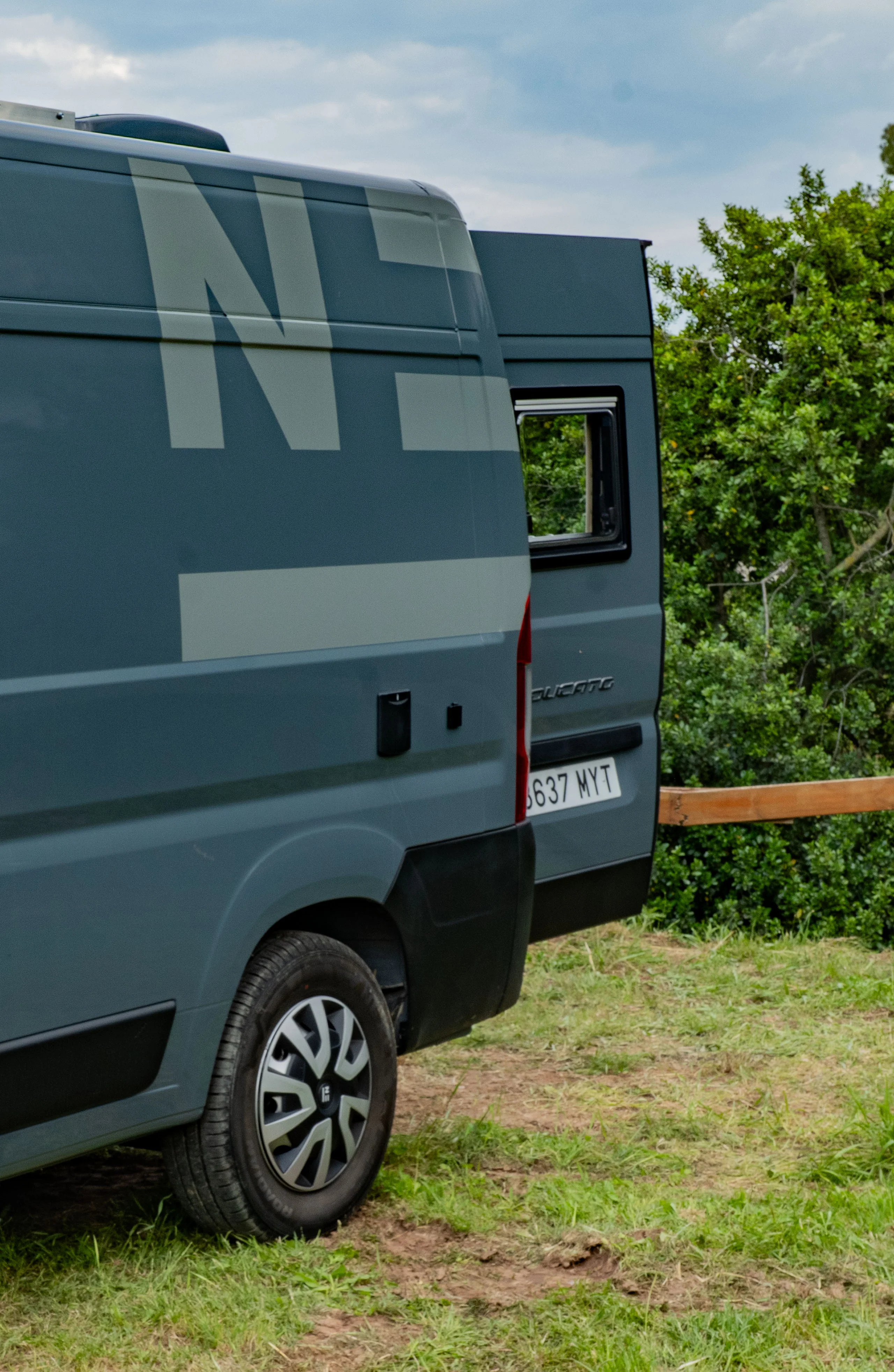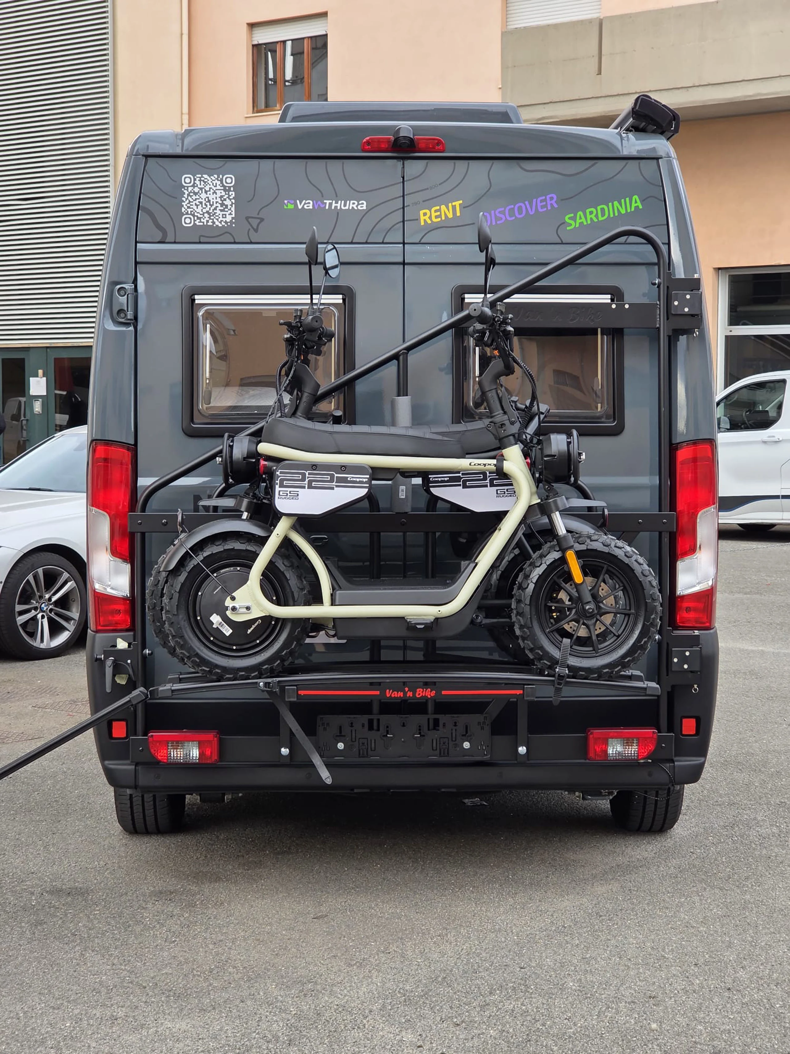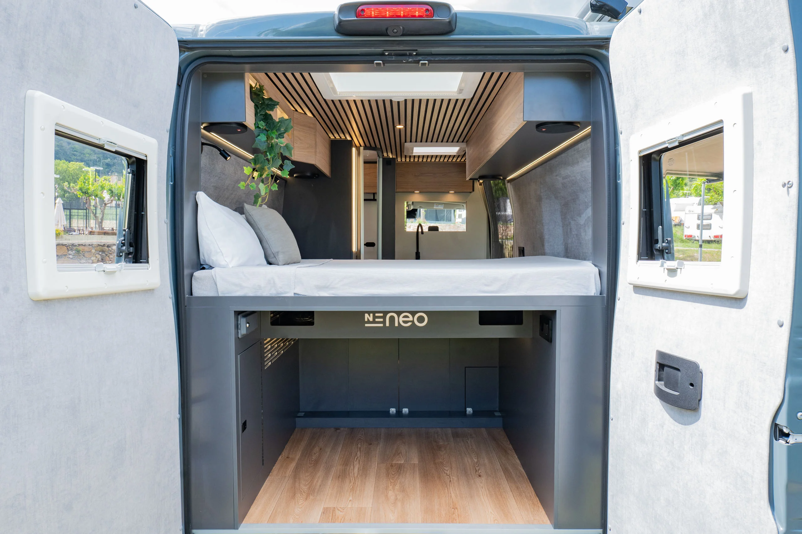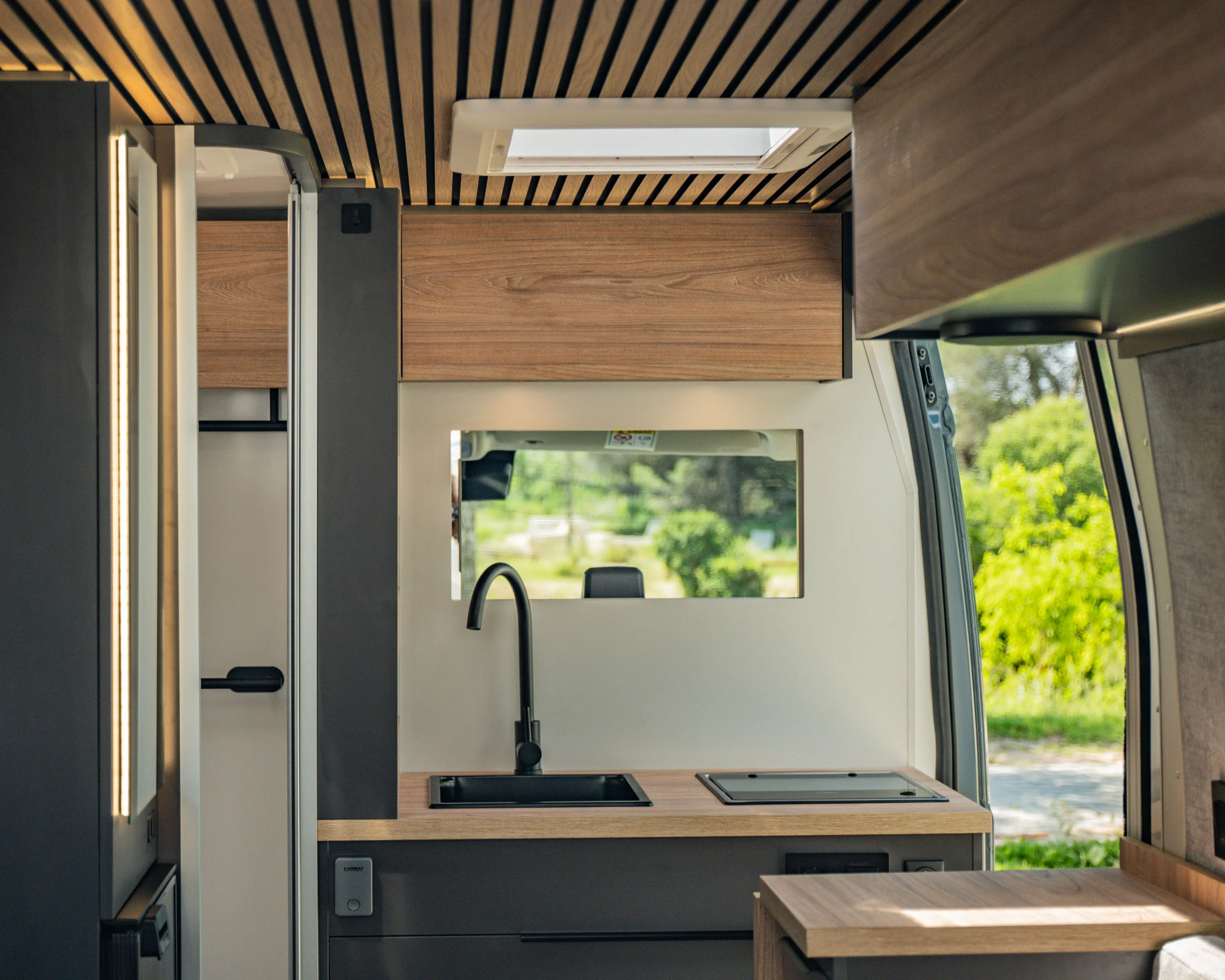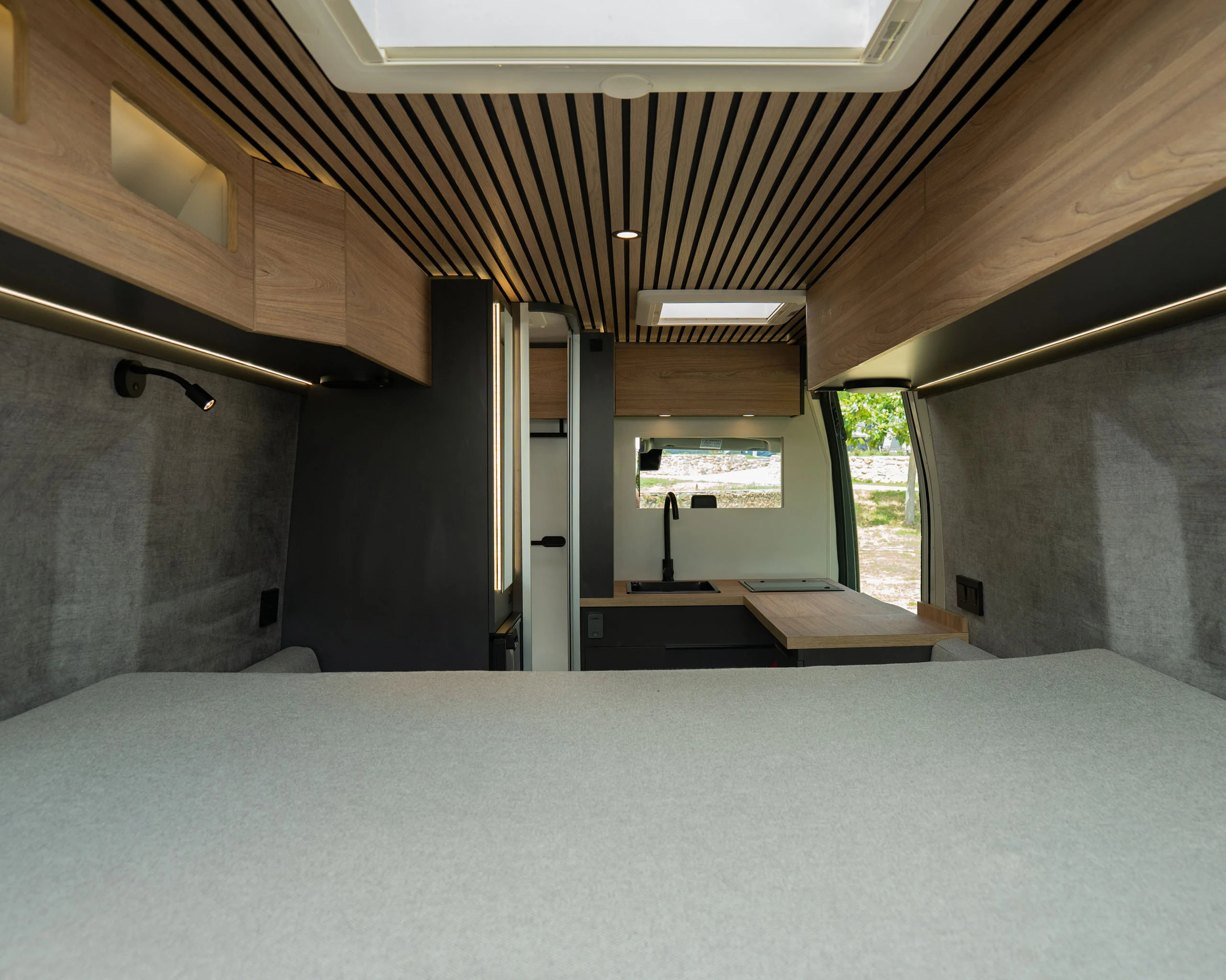 La linea pulita di un interno curato nei dettagli. La luce calda del tramonto che entra dal portellone aperto. Il mare a pochi passi, una strada sterrata che invita a proseguire.