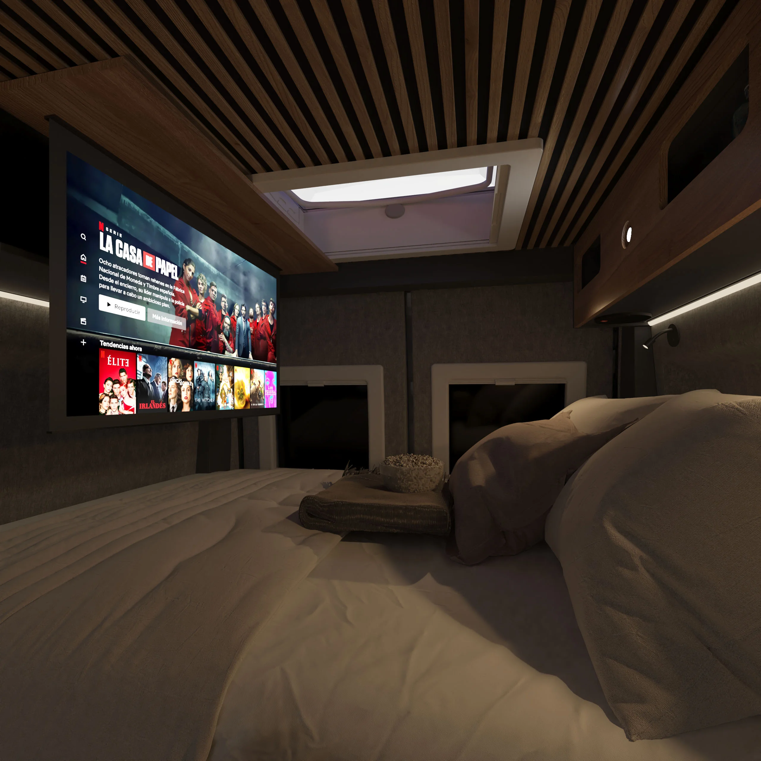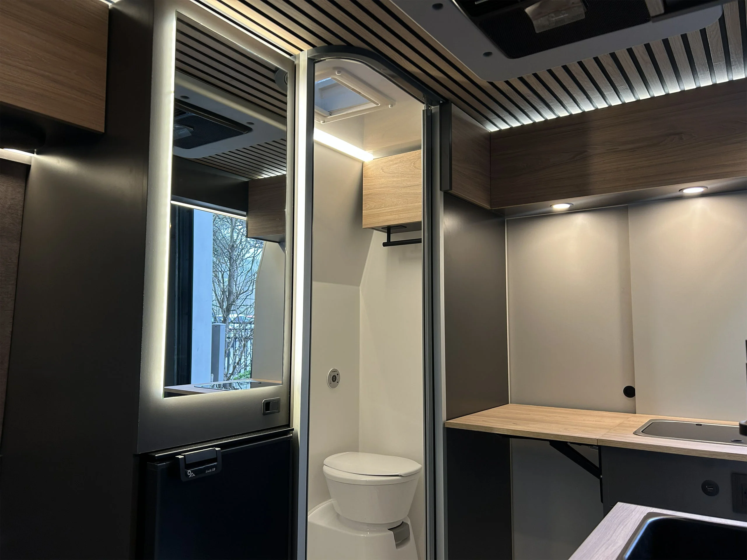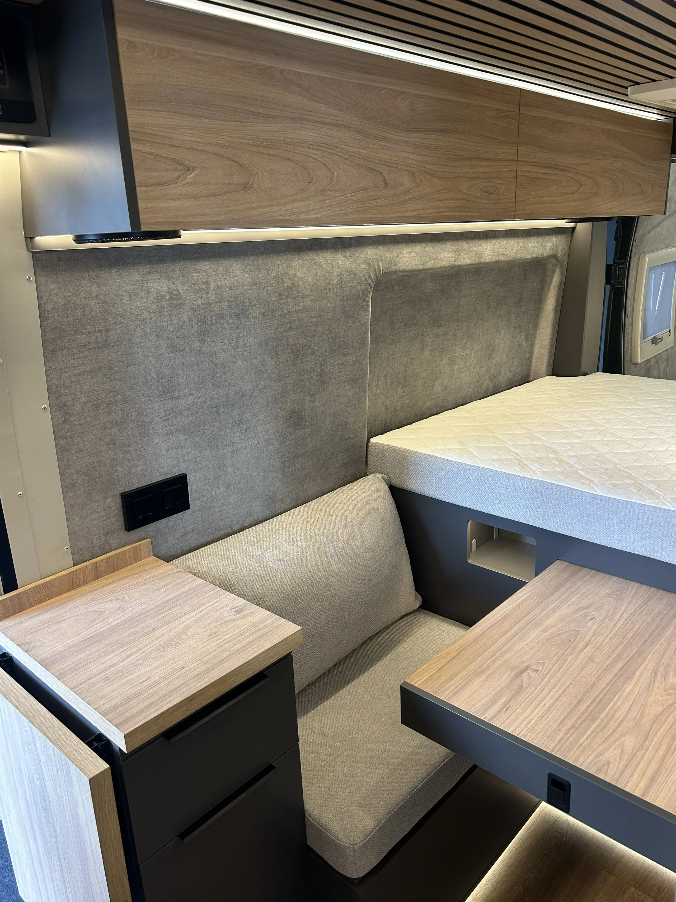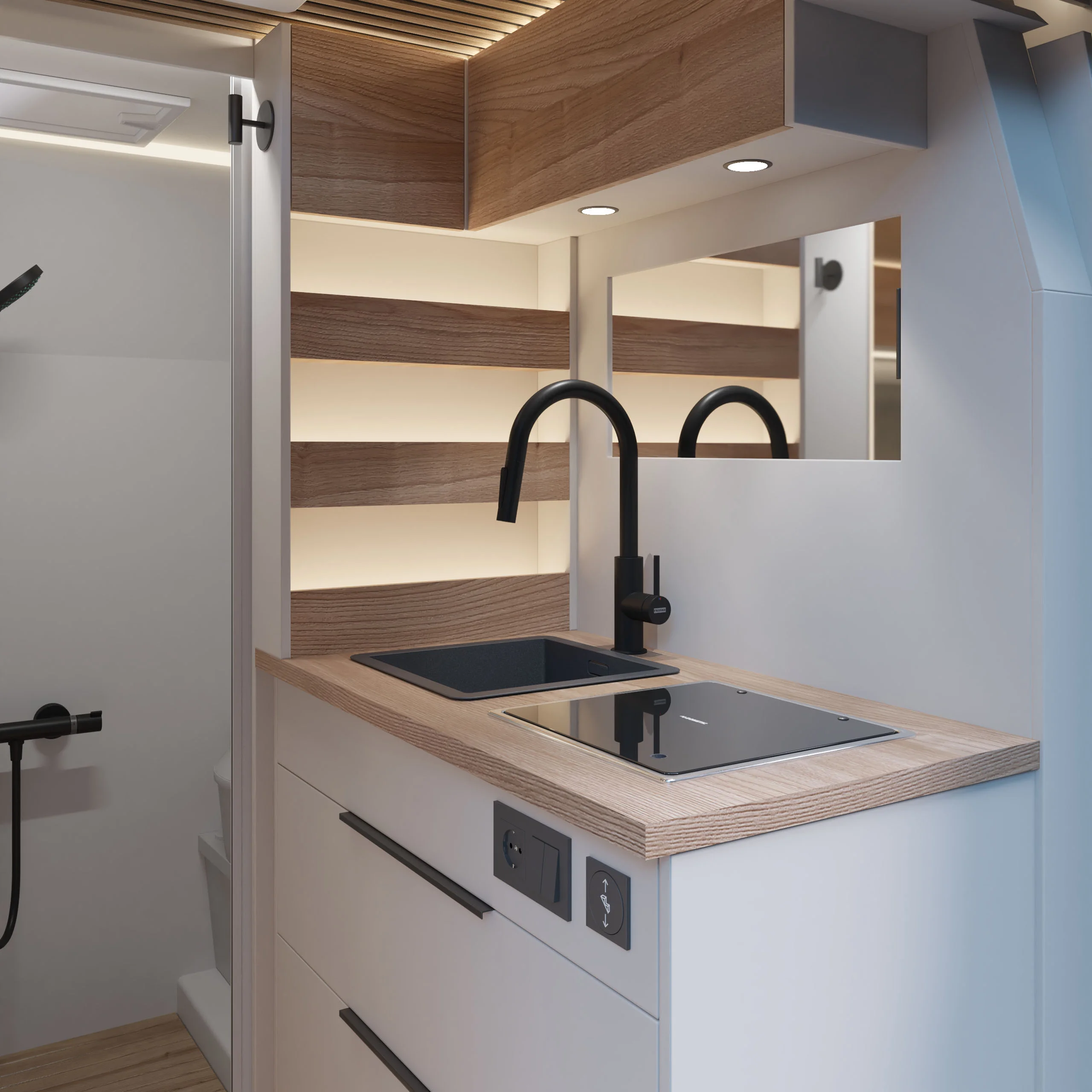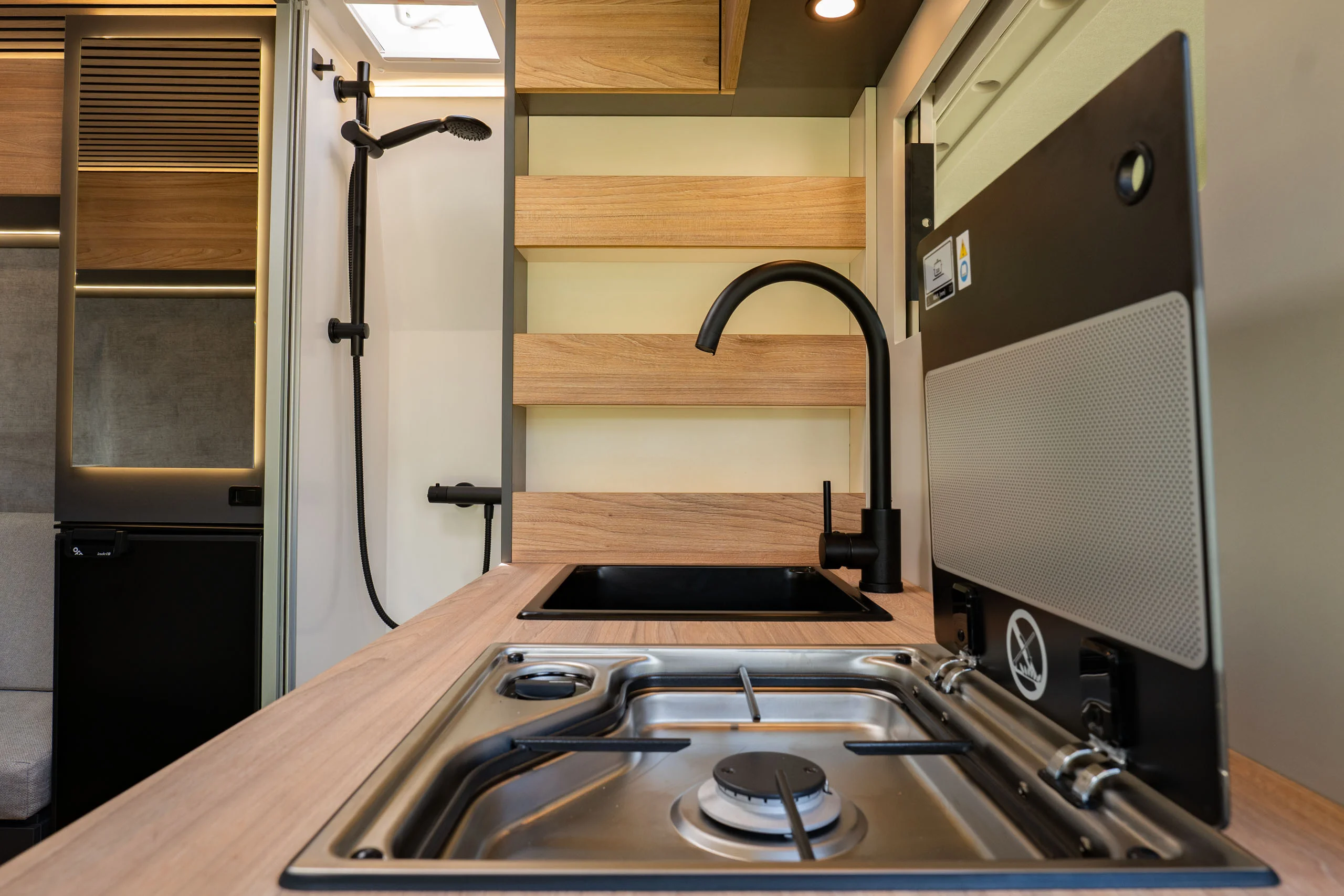 La linea pulita di un interno curato nei dettagli. La luce calda del tramonto che entra dal portellone aperto. Il mare a pochi passi, una strada sterrata che invita a proseguire.